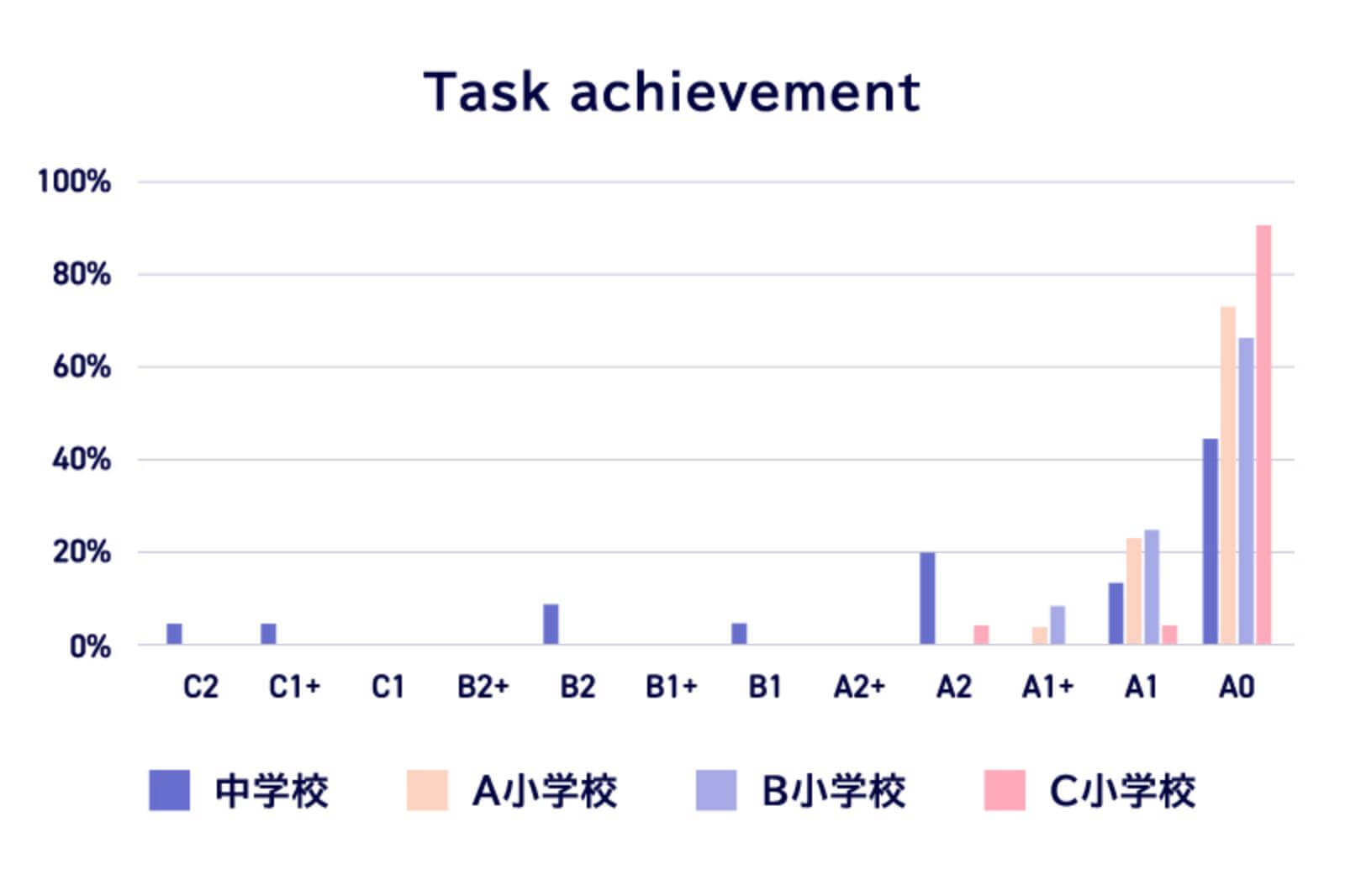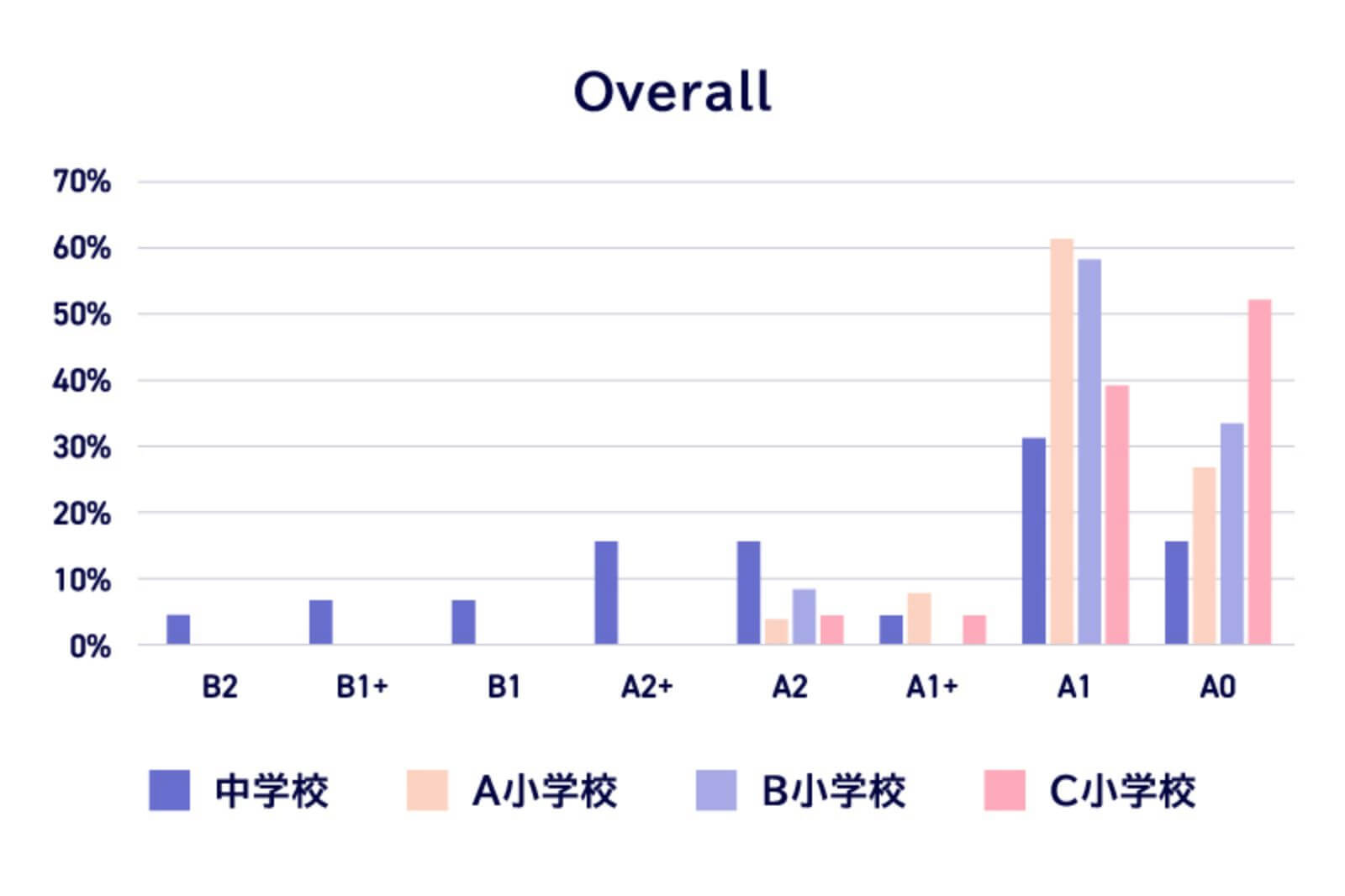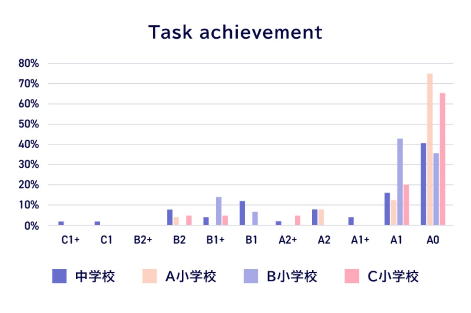 Pronunciationでは小中学校ともにA1レベルに集中し、基礎的な発音が一定程度定着している一方で、Fluencyでは小中学校でA2以上に過半数が集中しており、発音と流暢さに乖離が見られた。また、Task achivementでは、A0の割合が多く、小中学校ともに学習内容の理解が不足している可能性がある。Overallでは、A2以上に達している学習者とA0にとどまる学習者がおり、学習者の間に大きな差がある。