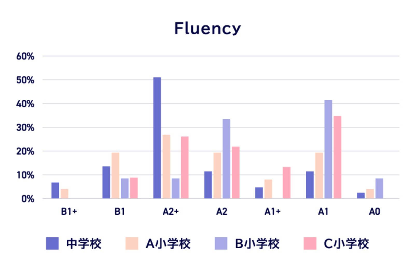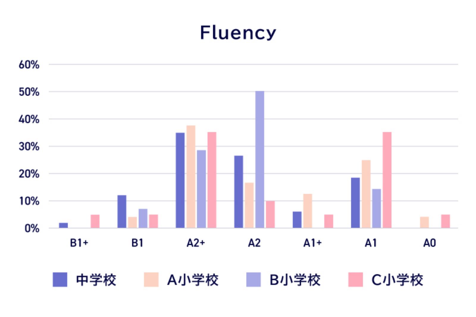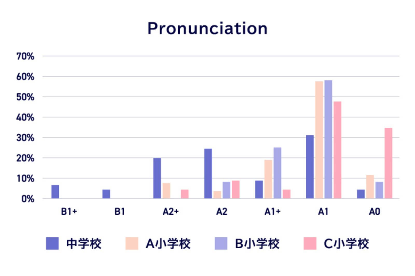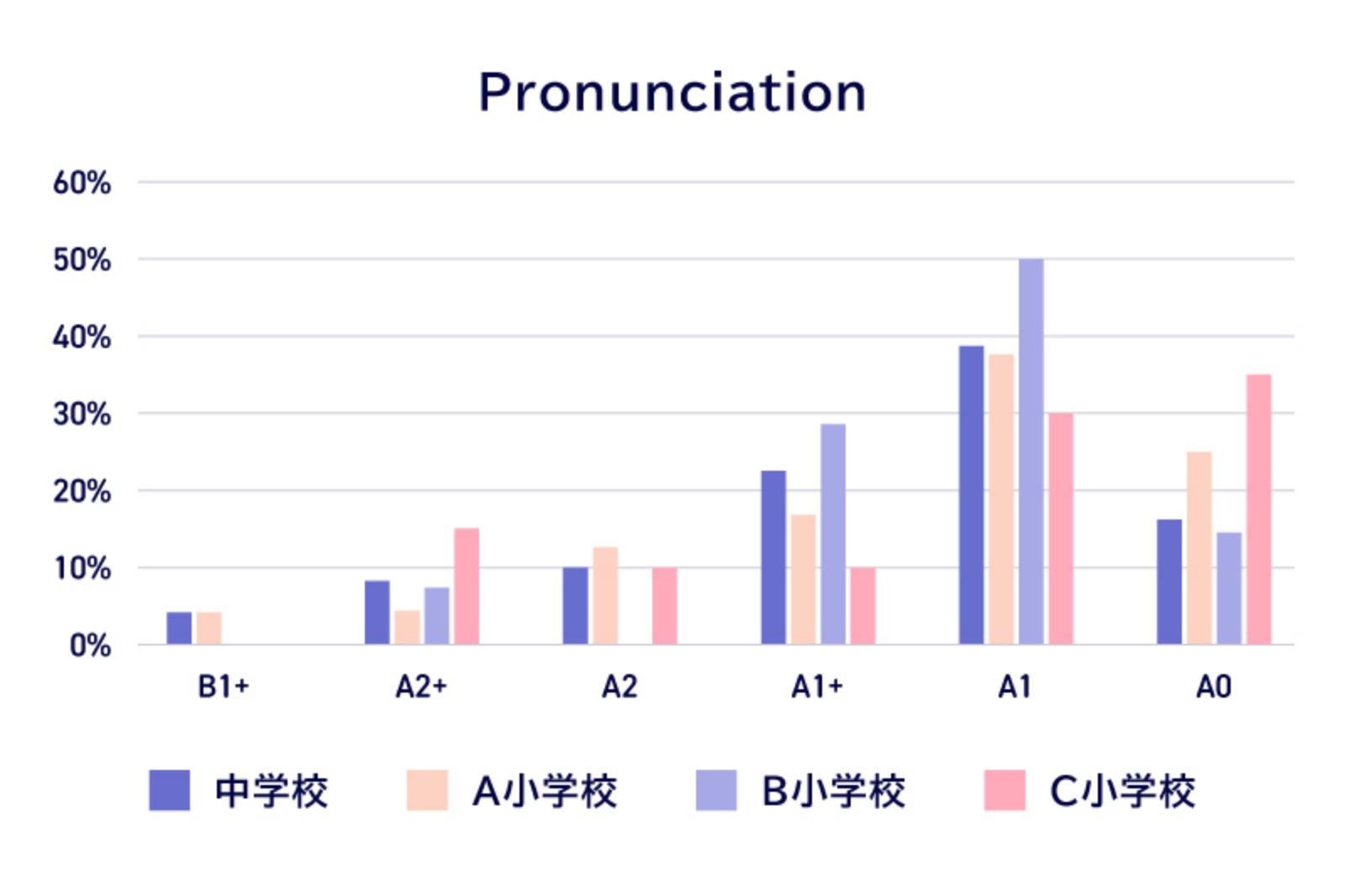 Pronunciationでは小中学校ともにA1レベルに集中し、基礎的な発音が一定程度定着している一方で、Fluencyでは小中学校でA2以上に過半数が集中しており、発音と流暢さに乖離が見られた。また、Task achivementでは、A0の割合が多く、小中学校ともに学習内容の理解が不足している可能性がある。Overallでは、A2以上に達している学習者とA0にとどまる学習者がおり、学習者の間に大きな差がある。