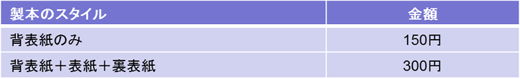また、A4サイズの製本サービスを提供しています。料金は以下の通りです。ご利用の場合には、学びセンター事務室までメールでご連絡ください。