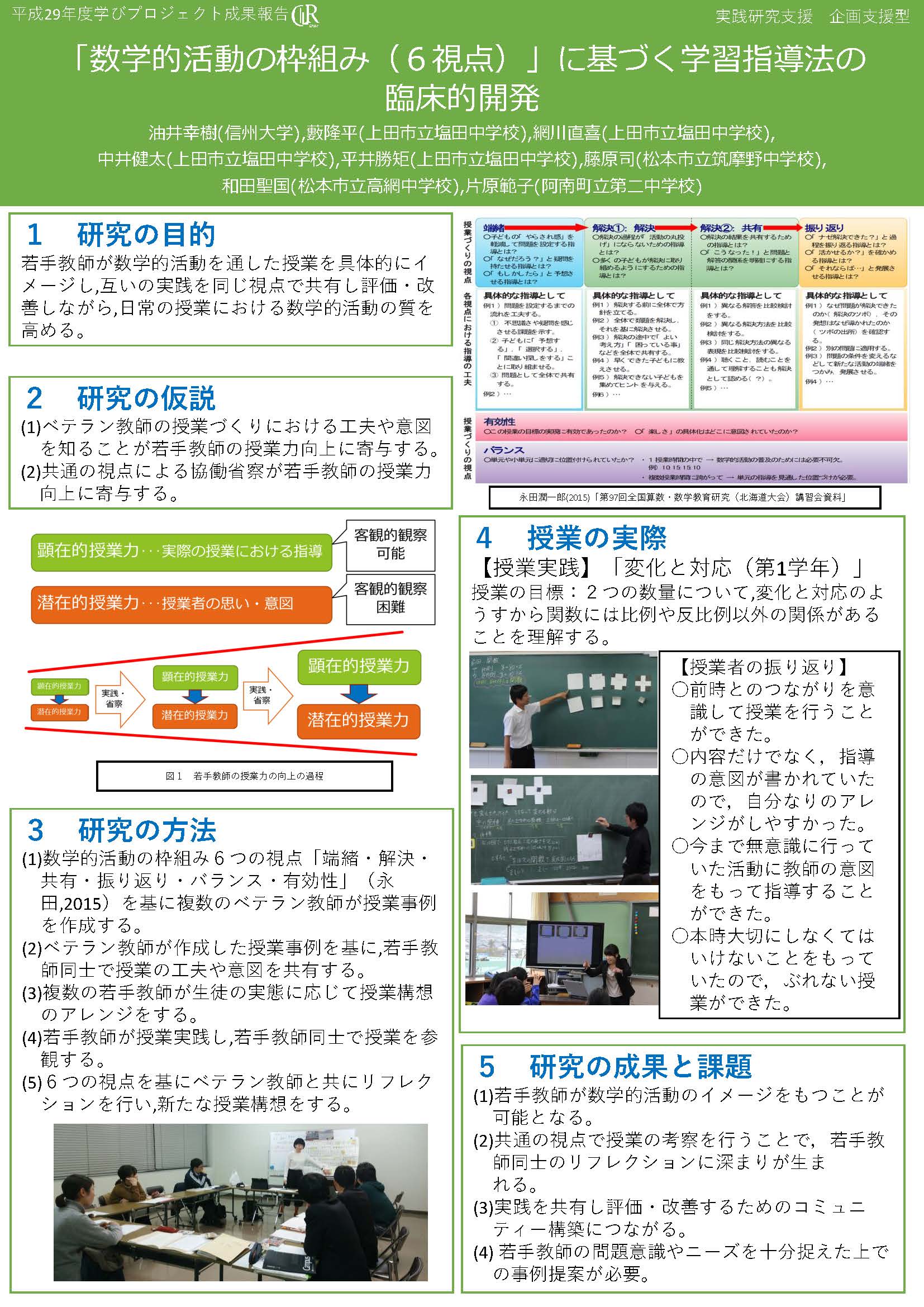 | プロジェクト名 | 「数学的活動の枠組み(6視点)」に基づく学習指導法の臨床的開発 |