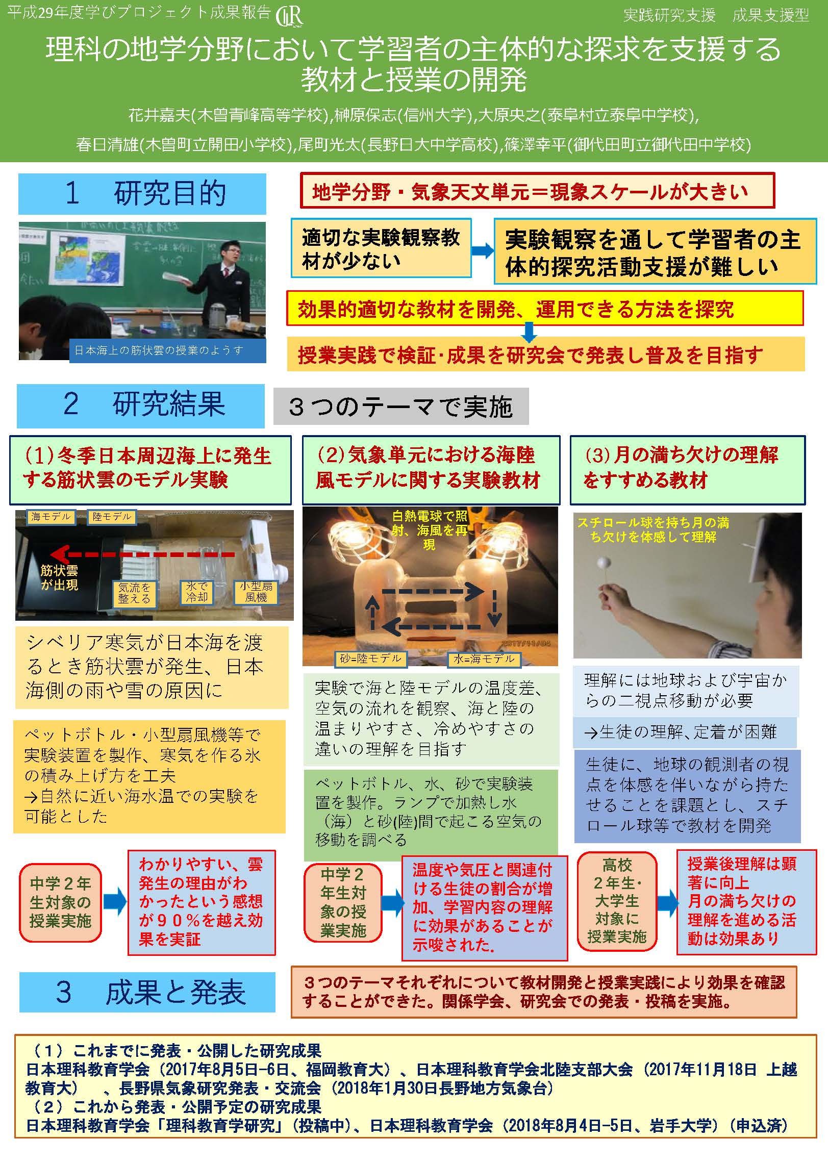 理科の地学分野はスケールの大きな現象を対象とするため、教室内での実験観察が困難である。特に気象・天文は適切な教材が少なく、実験観察を通して学習者の主体的な探究活動を支援することが難しい。本プロジェクトでは、これら諸分野において適切な教材を開発し授業で効果的に運用できる方法を探究し授業実践により検証すること、およびそれらの成果を理科教育に関する各研究会で発表、普及することを目的とした。研究は、冬季日本周辺海上に発生する筋状雲のモデル実験、気象単元における海陸風モデルに関する実験教材、月の満ち欠けの理解をすすめる教材、の3テーマで実施した。それぞれについて教材開発と授業実践により効果を確認したうえで、関係学会、研究会での発表をおこなった。 |