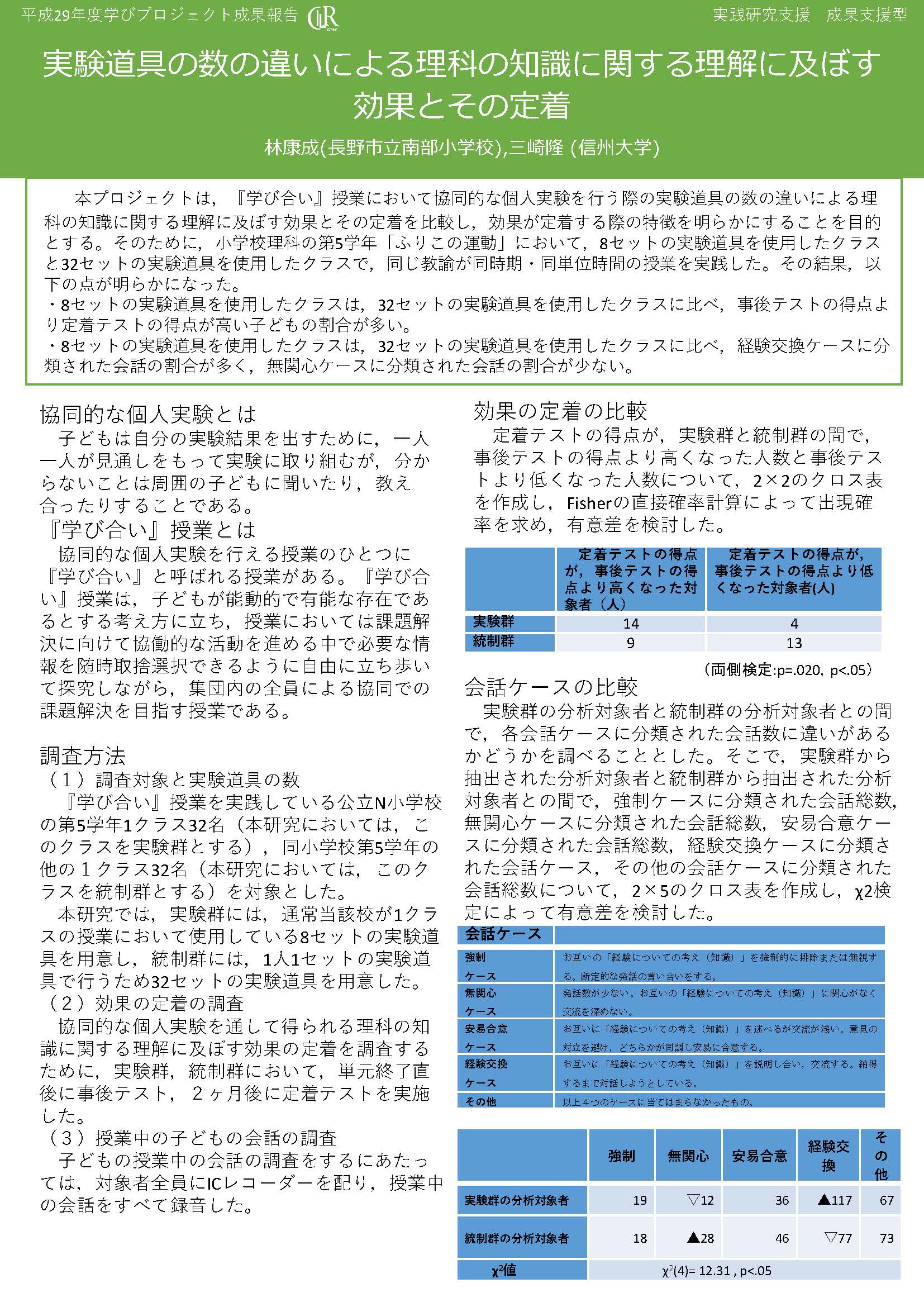 本プロジェクトは,『学び合い』授業において協同的な個人実験を行う際の実験道具の数の違いによる理科の知識に関する理解に及ぼす効果とその定着を比較し,効果が定着する際の特徴を明らかにすることを目的とする。そのために,小学校理科の第5学年「ふりこの運動」において,8セットの実験道具を使用したクラスと32セットの実験道具を使用したクラスで,同じ教諭が同時期・同単位時間の授業を実践した。その結果,以下の点が明らかになった。 |