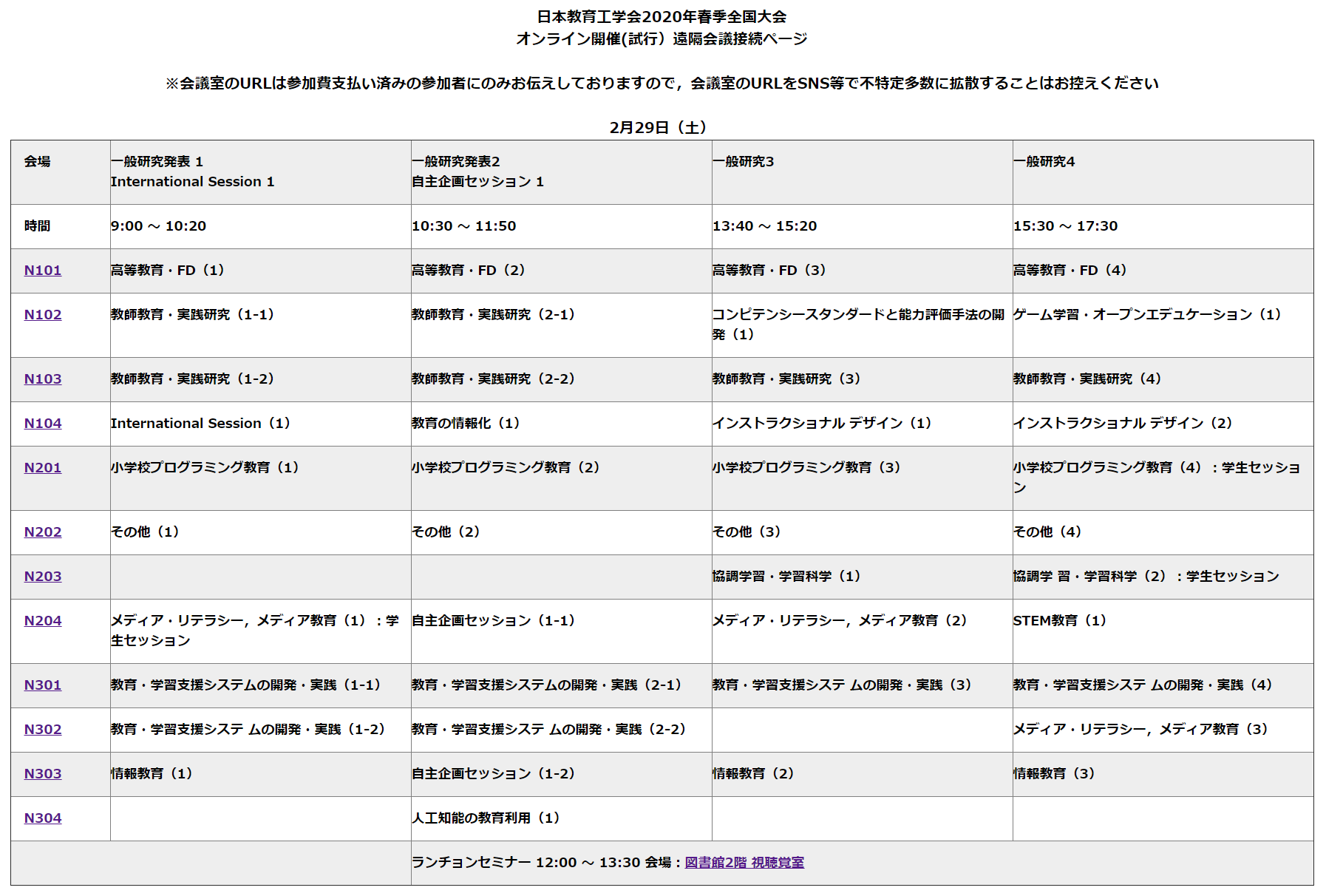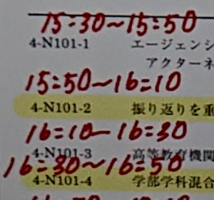・通常,発表者となっている場合,そのセッション時に会場教室を離れるのは困難であるが,座長に断りを入れ,他のセッションで聞きたかった発表をチェックし,また戻ることを行った。そもそも中座することの障壁が低いシステムなので,どの程度許容するかは検討の余地はある。