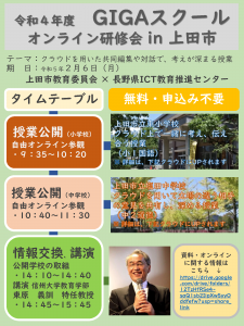 長野県ICT教育推進センターでは、信州大学教育学部附属次世代型学び研究開発センターと上田市教育委員会と連携し、本年度4回目のGIGAスクールオンライン研修会を2月6日(月)に計画しています。