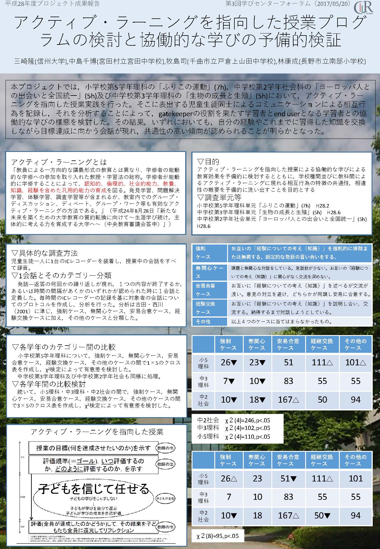 | プロジェクト名 | アクティブ・ラーニングを指向した授業プログラムの検討と協働的な学びの予備的検証 |