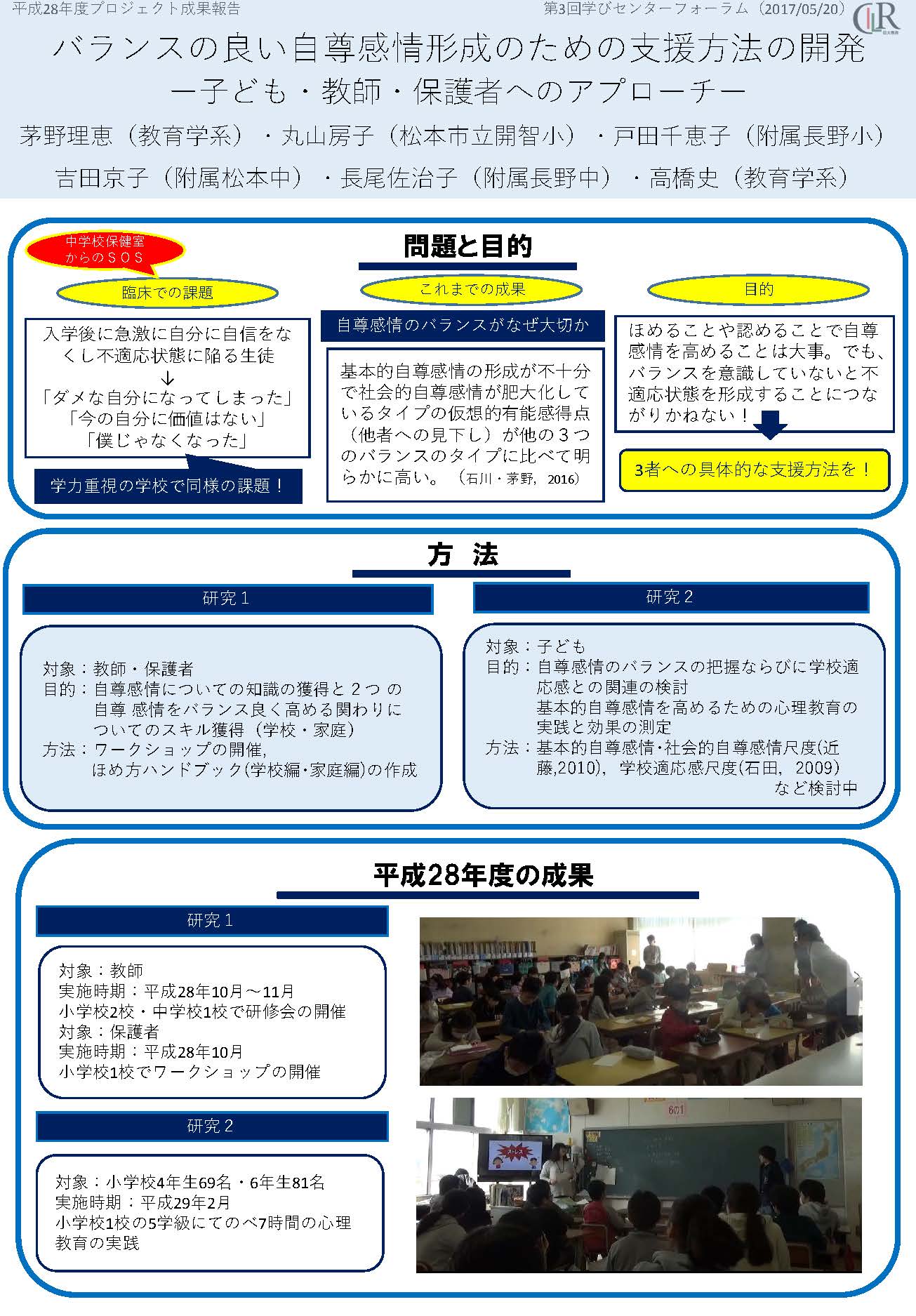 プロジェクトの取り組みと成果の概要 バランスのよい自尊感情形成のための支援方法の開発として、平成28年度は、間接的アプローチとして自尊感情についての理解を促進する教師・保護者を対象とした研修会の実施(小学校2校・中学校1校)と直接的アプローチとして児童生徒を対象とした自尊感情に関わる心理教育の実践を行った(小学校1校5学級のべ7回)。現段階で、バランスのよい自尊感情形成のためのほめ方ハンドブックの作成や心理教育の効果の測定までは至っていない。しかし、学びセンターによる支援により、研究協力者の在籍する小中学校4校の保健室に心理教育に関する書籍や支援ツールを充実させることが可能となり、日常での児童生徒の心理支援についての実践がより充実したものとなっている。